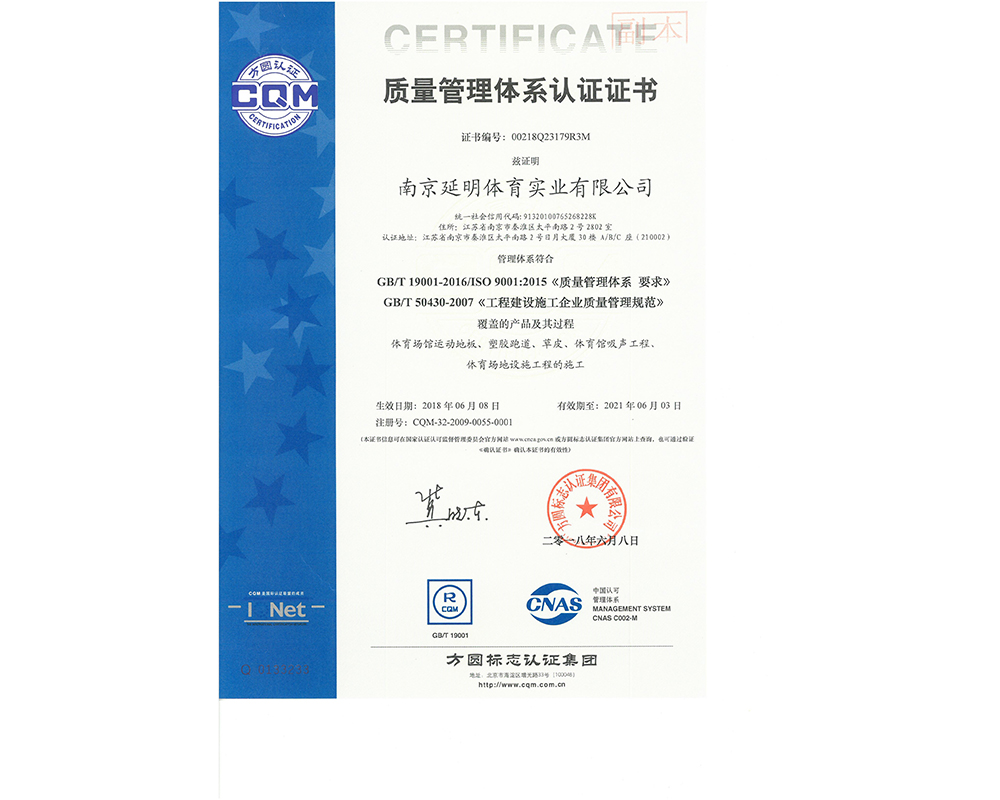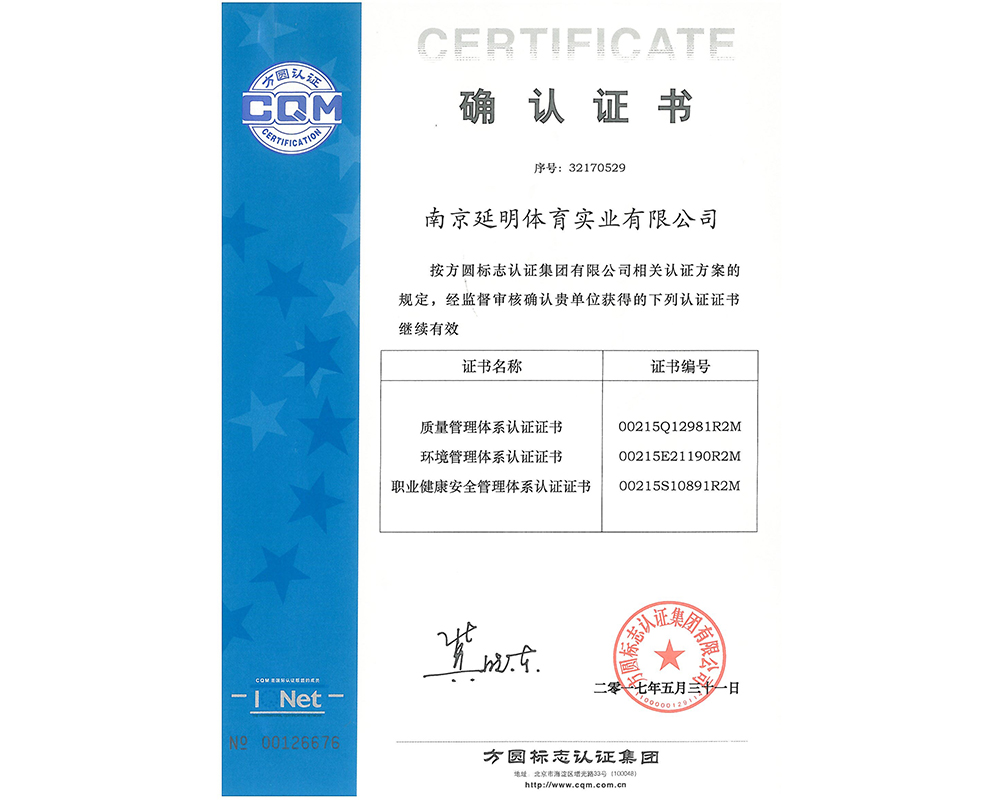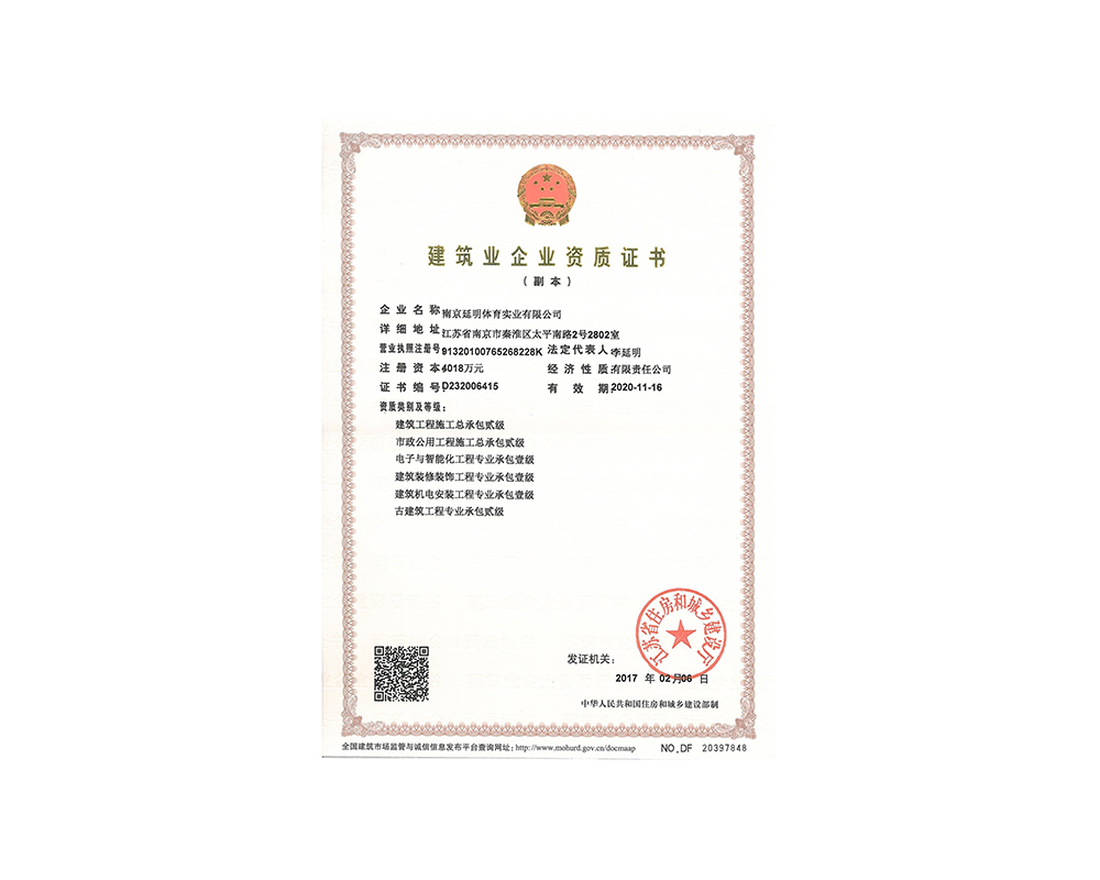 作为江苏省体育产业示范单位,8xbet体育(中国)官方网站体育拥有多年相关工程总承包施工经验,取得建筑工程施工总承包二级、古建筑工程专业承包二级、建筑装修装饰工程专业承包一级、电子与智能化工程专业承包一级、市政公用工程施工总承包二级资质;通过ISO 9001:2015质量管理体系认证;通过ISO14001:2015环境管理体系认证;通过IOS45001:2018职业健康安全管理体系认证。